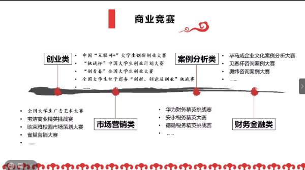 来自市场营销专业的周雨倩学姐分享了她参与竞赛的经验与心得。她将竞赛分为了三大类:学科竞赛类、学术竞赛类、商业竞赛类,依次介绍了这三类竞赛的特点、规则,并提供了备赛策略。