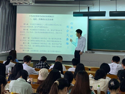 会议伊始,开凯老师展示并分析了本学期高等数学期中考试有关情况;针对即将到来的四六级考试、期末考试等,开凯老师带领同学们回顾了学校《考试纪律和考试违纪处理规定》的有关规定,要求同学们端正态度、严肃考风考纪、杜绝作弊等行为,不为自己的人生留下不良记录;此外他还对同学们存在的考试焦虑等情况给出了自己的解决方法。