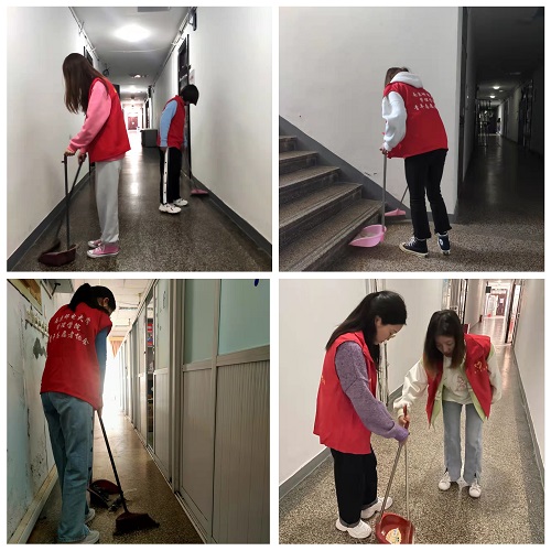志愿者们穿着红马甲,拿着工具,积极投身到清扫活动中,清理教研室与有线楼的每一个角落。经过研究生们的共同努力,有线楼显得格外窗明几净。