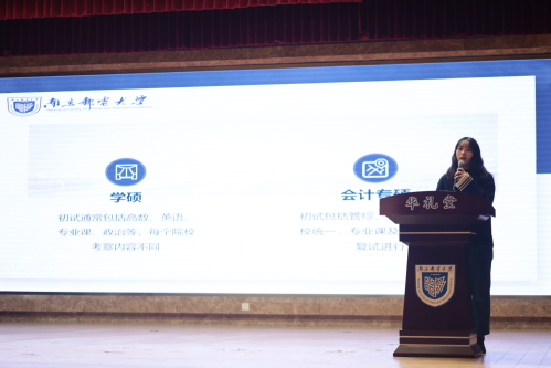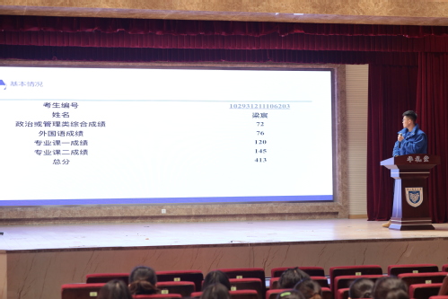 梁宸同学客观分析考研现状,告诫同学们要端正考研动机,坚持自己的道路选择。他结合自己报考本校并取得成功的实际体验,分享择校经验,提醒同学们切勿眼高手低。在复习迎考方面,他提出要分阶段、有针对性地复习,为仍对考研复习感到迷茫的同学提供着力方向。
