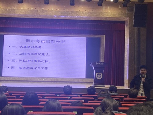 会议伊始,辅导员开凯就期末考试和诚信考试进行再动员和部署,希望全体同学能够将重心聚焦在即将到来的期末考试,认真复习备考,争取顺利通过各门课程,同时要牢固树立诚信考试意识,要自觉践行《诚信考试承诺书》的各项要求,坚决杜绝各种考试不诚信现象。此外开凯老师还就近期宿舍宿舍违章电器查处情况、宿舍消防安全、元旦假期安全要求、寒假离校安排和疫情防控工作进行再强调,希望全体同学始终牢固树立安全红线意识,严格遵守各项规定,坚决消除各类安全隐患,确保期末本年级总体安全、稳定。